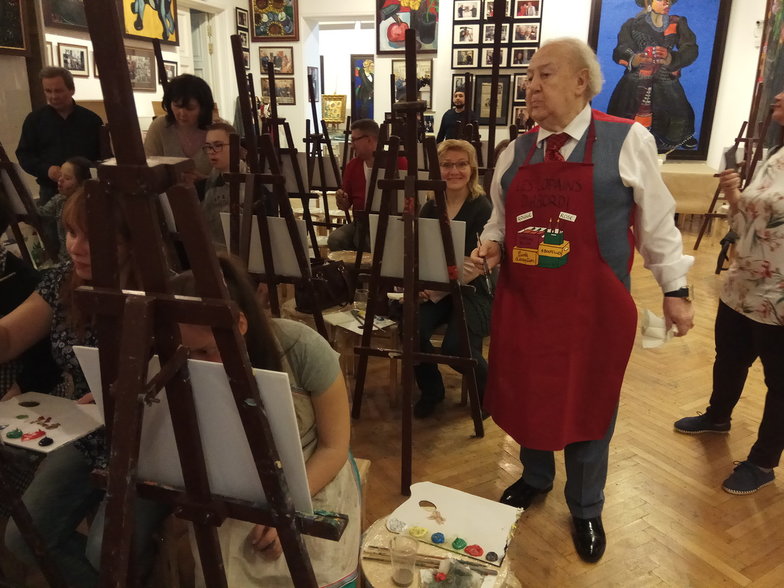 Сначала Церетели рассматривает работы юных художников! Похоже, ему действительно очень интересно, что происходит на листах картона. С удивлением замечает, что несколько ребят по памяти рисуют его картины. Улыбается и идёт к своему холсту. В ближайшие два часа он будет только рисовать, в такт неторопливым песням на грузинском языке, которые звучат из невидимого репродуктора. И мы тоже будем только рисовать... Рядом.