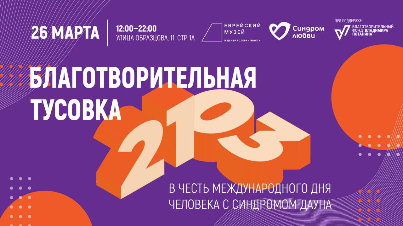 26 марта в Еврейском музее и Центре толерантности состоится благотворительная тусовка «21/03» в пользу фондов «Синдром любви» и «Даунсайд Ап». Она приурочена к Международному дню человека с синдромом Дауна, который отмечается ежегодно 21 марта.